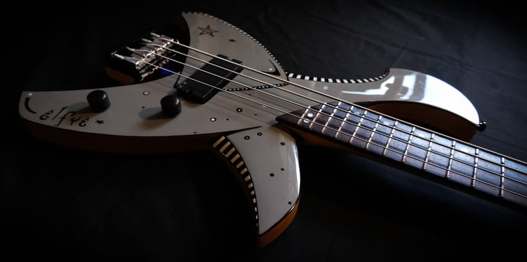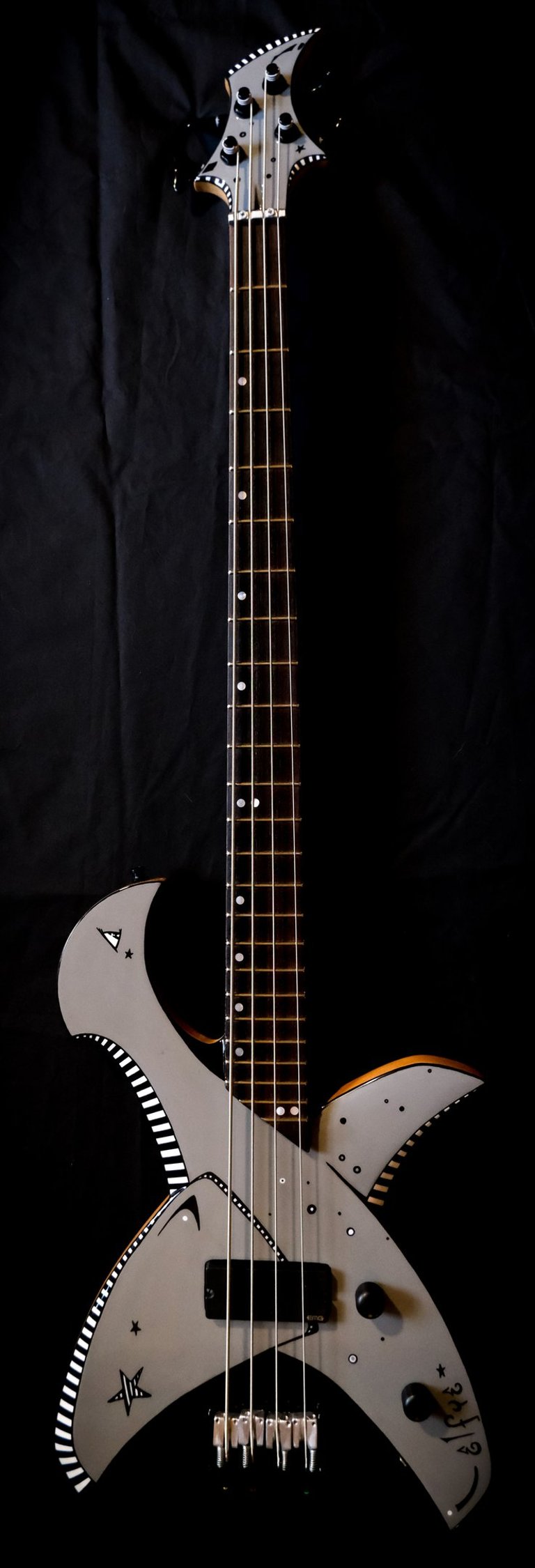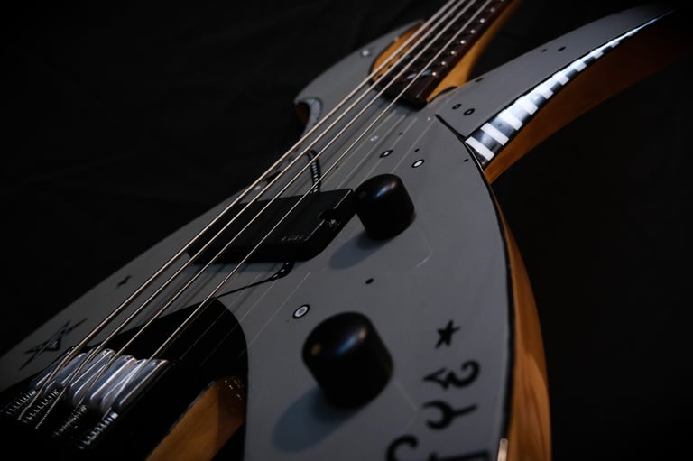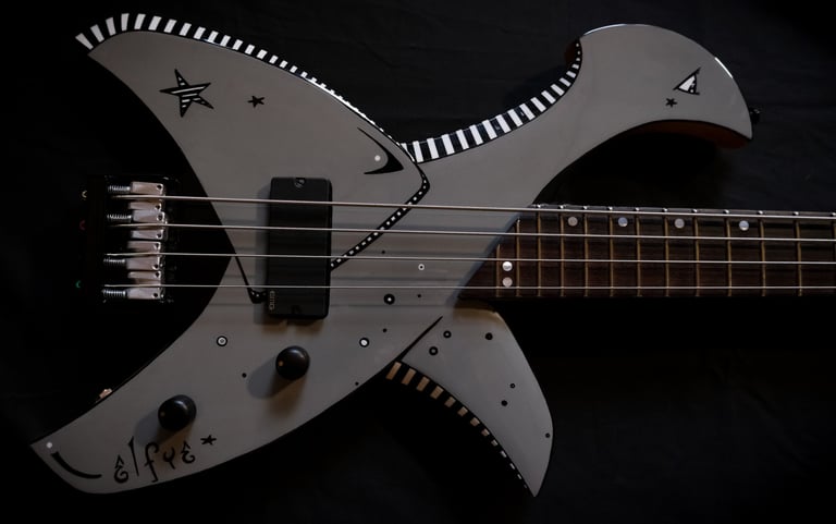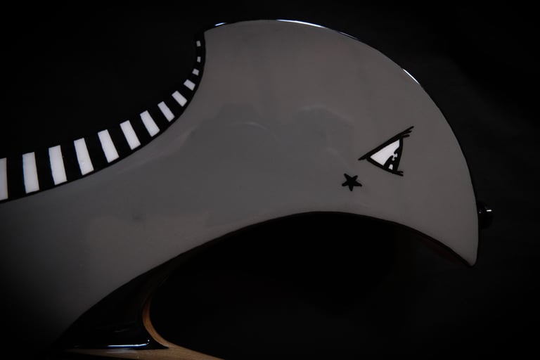 Je suis allé un peu plus loin encore dans le "fait maison", puisque même le chevalet et le sillet sont faits à la main, taillés et sculptés dans des bouts de moyeux de mon ancienne 106 ^^. Pour la touche artistique, c'est le coup de pinceau d'Elfye* qui donne vie à ce nouvel instrument !Un micro, un volume, une tonalité... Simple, basique...: Booooooom !!! Elle a un son incroyable