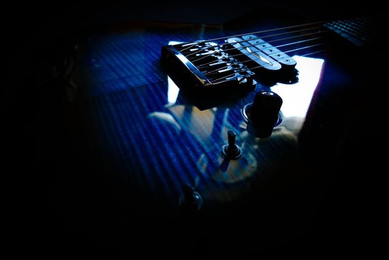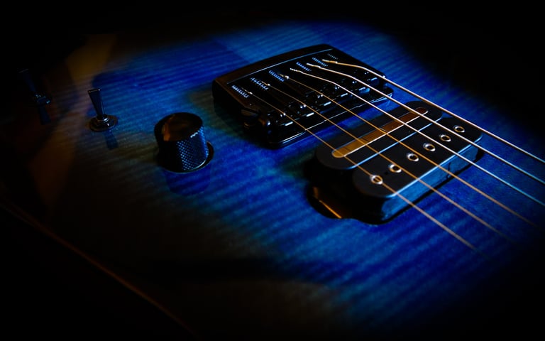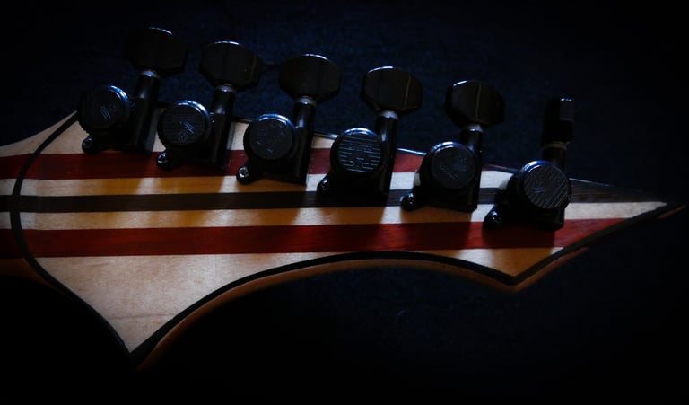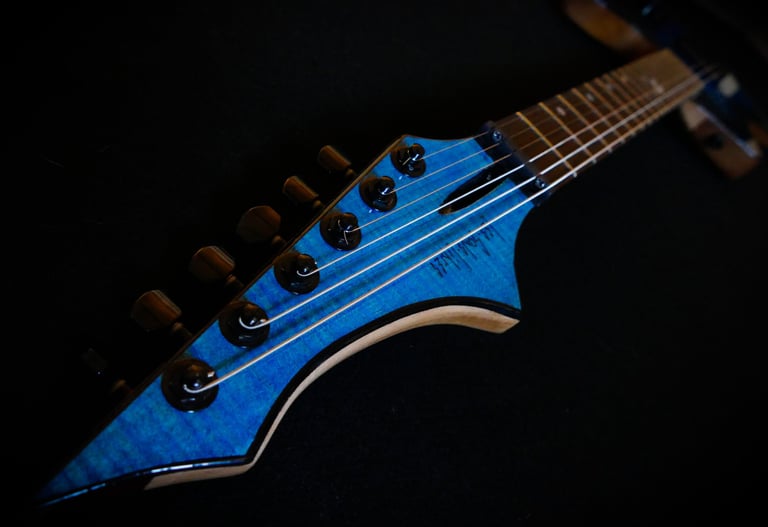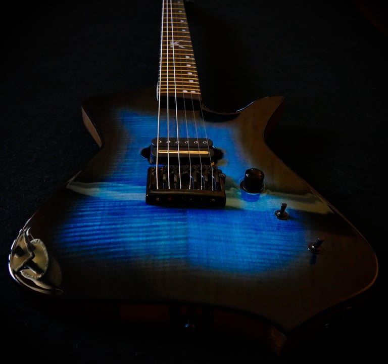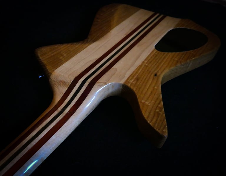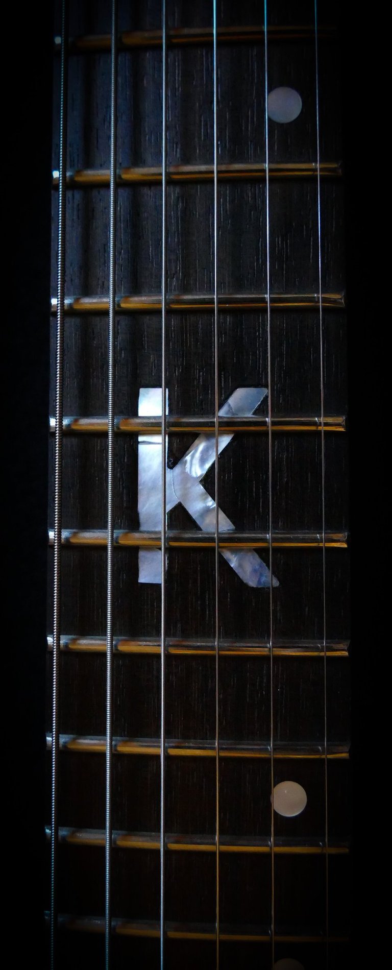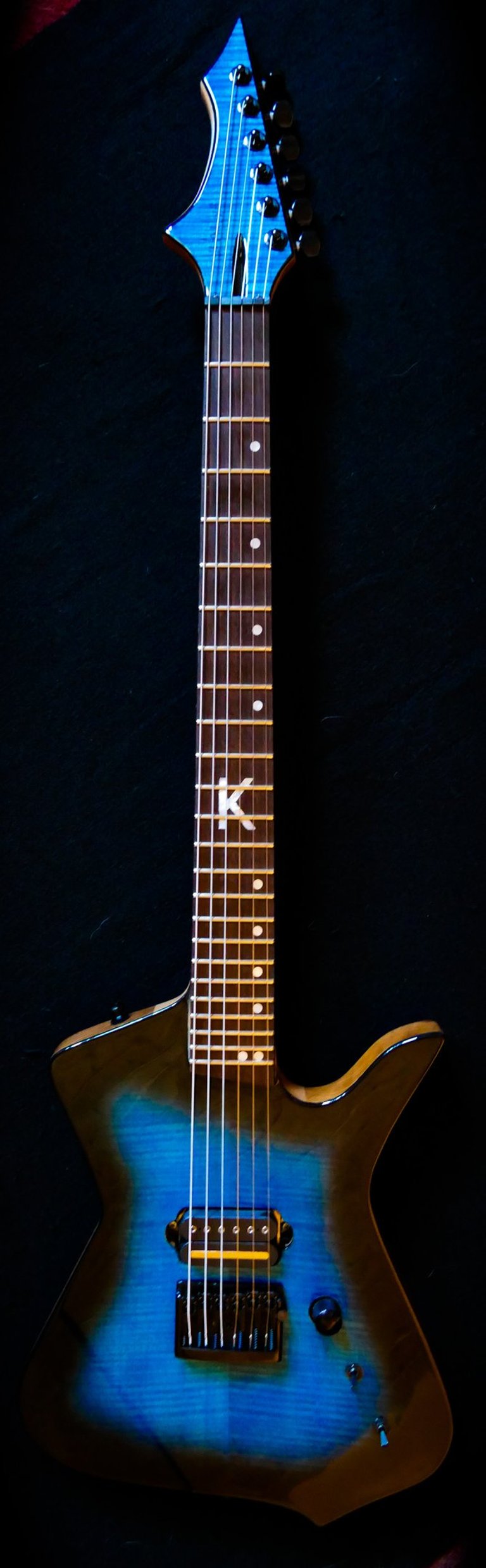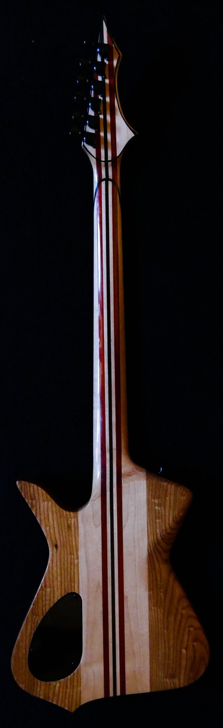 Au programme, manche traversant érable / padouk / wengé, ailes en orme de chez nous, un seul micro DiMarzio D-Sonic, un seul potar de volume, un réglage en Drop C et un poids de 2.6Kg... Vous l'aurez compris, elle n'est pas destinée à faire carrière dans la variété française...