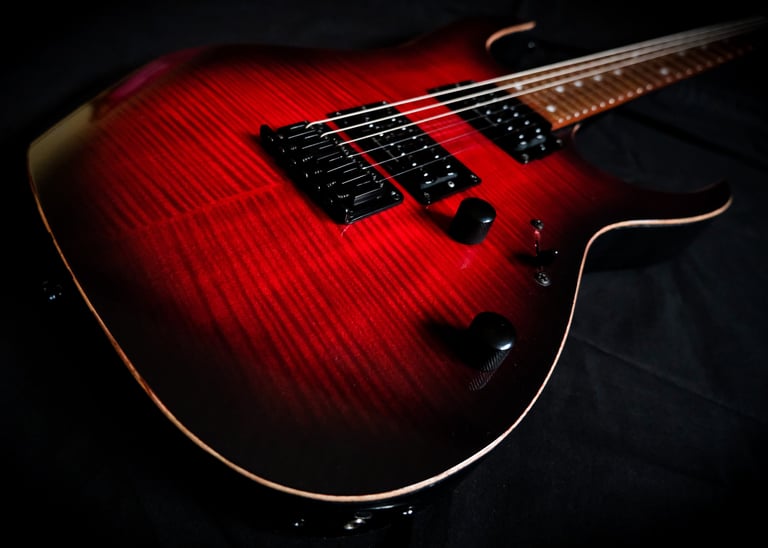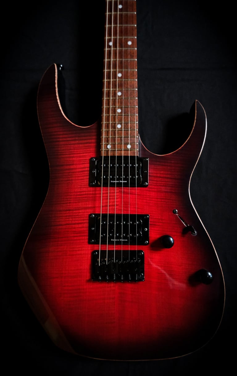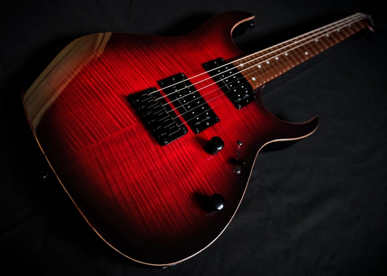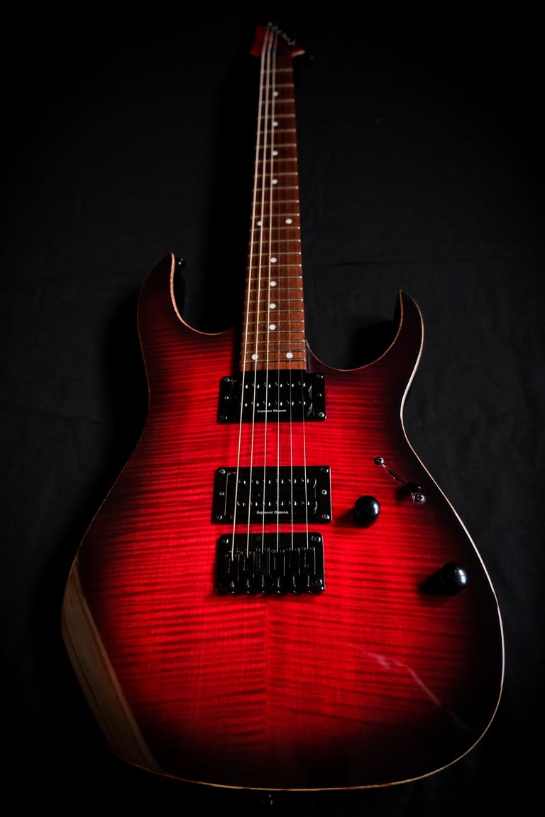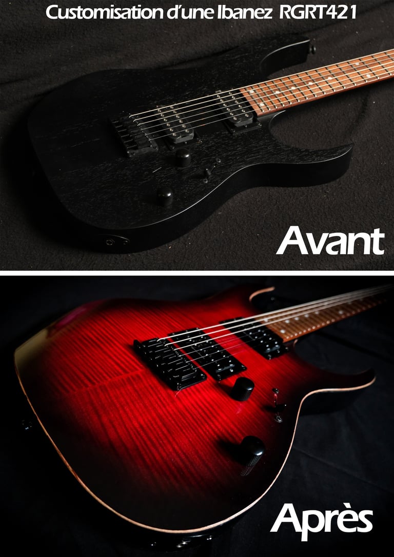 Voilà un projet de customisation que je viens de terminer sur une Ibanez Guitars RGRT421...: Placage érable ondé sur le corps et la tête, teinte rouge et dégradé noir, vernis brillant. Pour l'électronique, montage en Seymour Duncan Invader et câblage spécifique pour plus de possibilités sonores ! Pour finir, réglage parfait pour un accordage assez particulier ( open de Do ) et elle est prête à riffer !!!