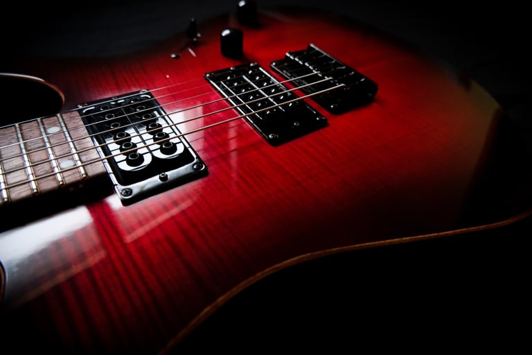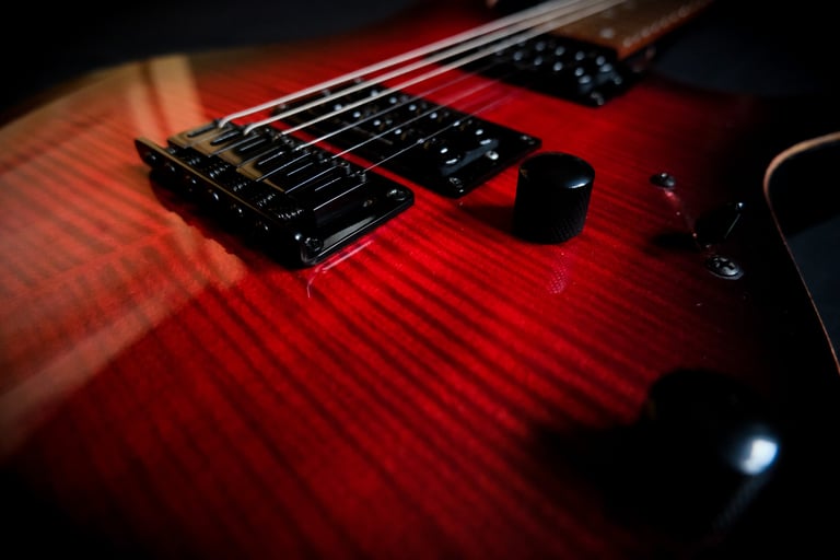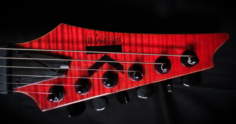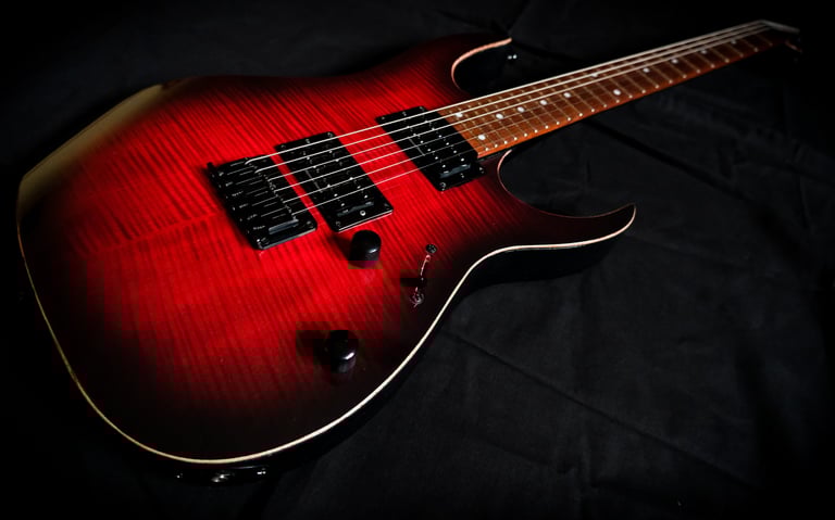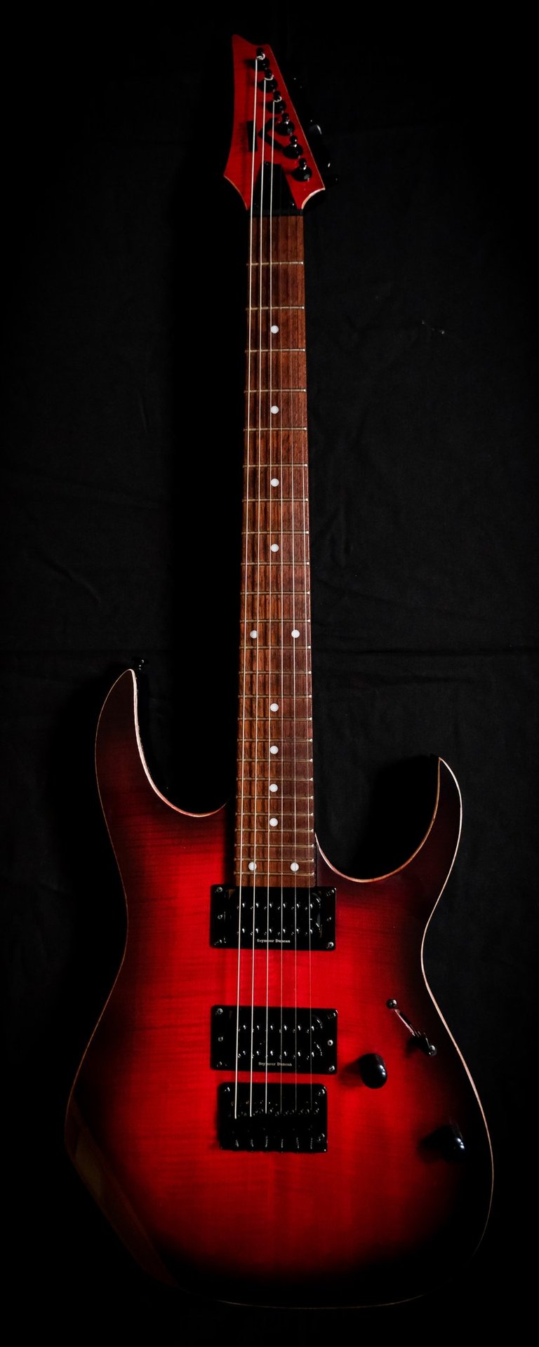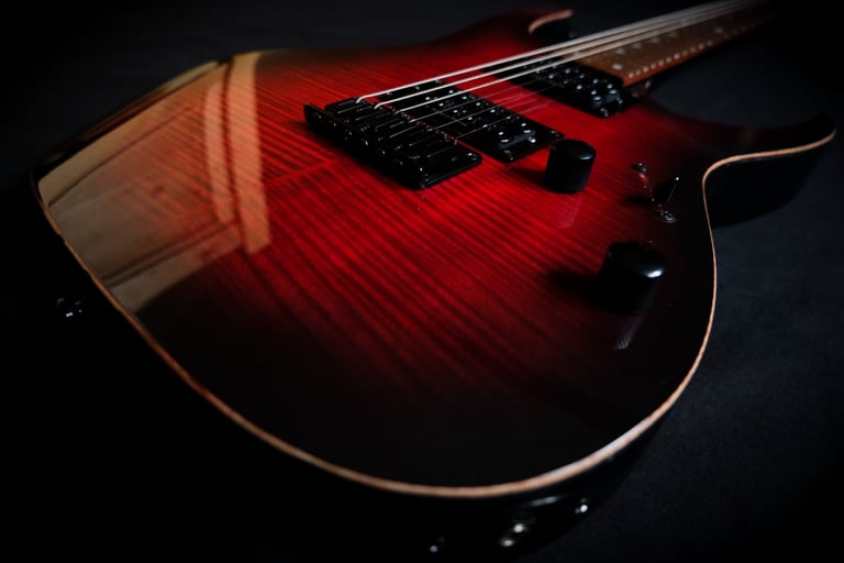 Voilà un projet de customisation que je viens de terminer sur une Ibanez Guitars RGRT421...: Placage érable ondé sur le corps et la tête, teinte rouge et dégradé noir, vernis brillant. Pour l'électronique, montage en Seymour Duncan Invader et câblage spécifique pour plus de possibilités sonores ! Pour finir, réglage parfait pour un accordage assez particulier ( open de Do ) et elle est prête à riffer !!!