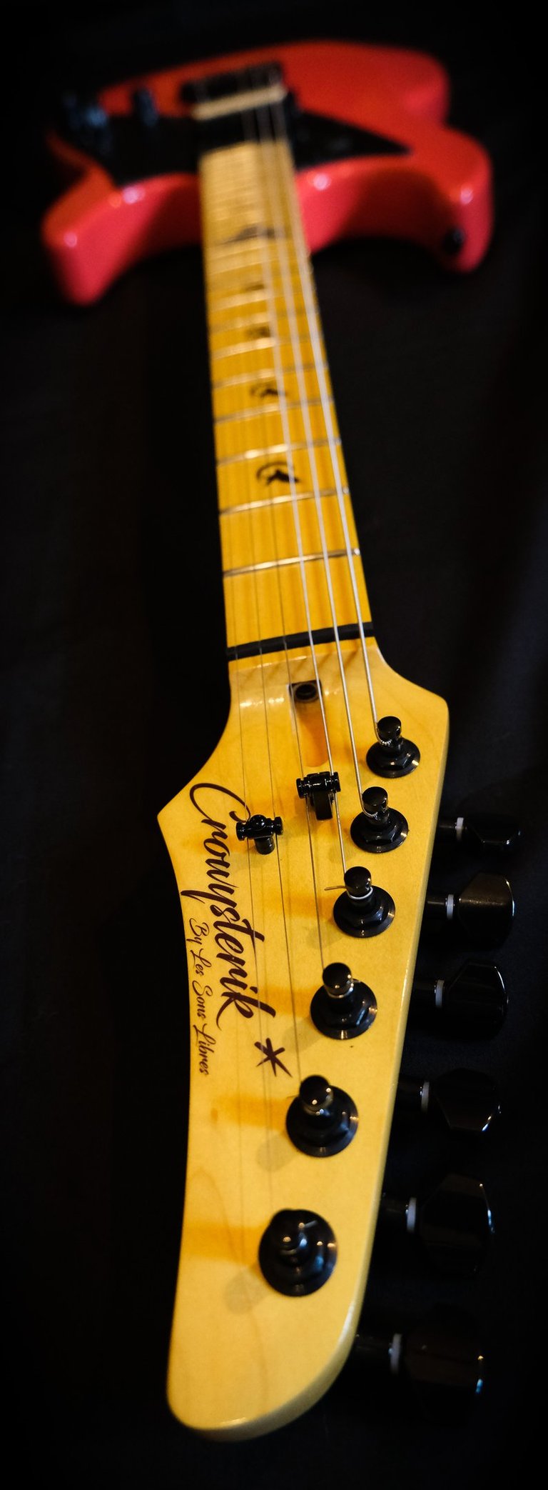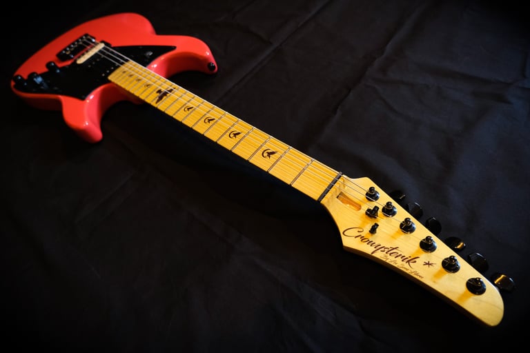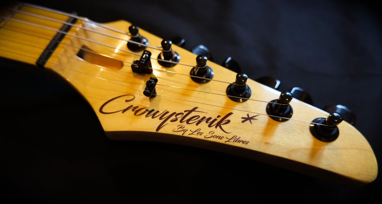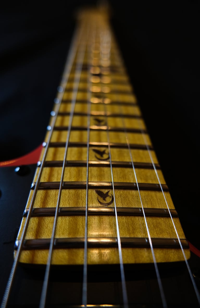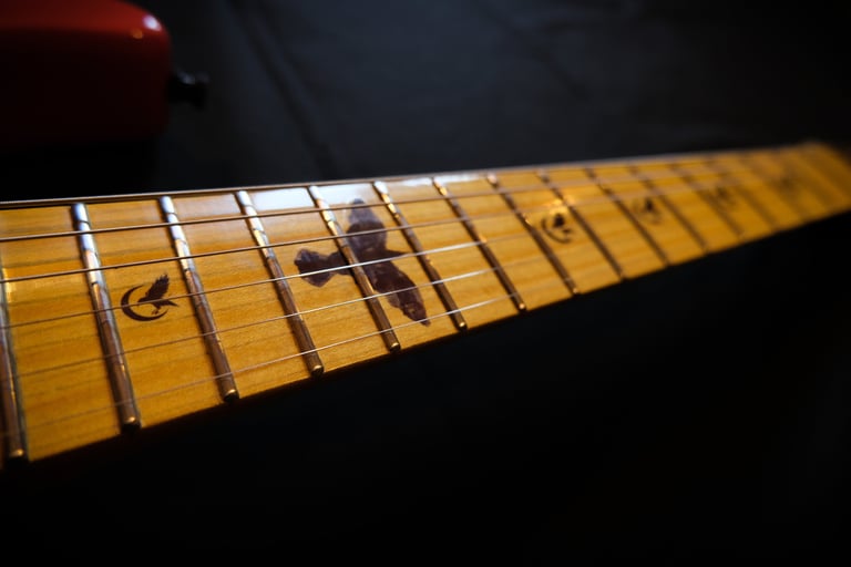 Décollage de la touche initialement en palissandre pour coller une touche érable et montage de frettes inox + décoration "crow"